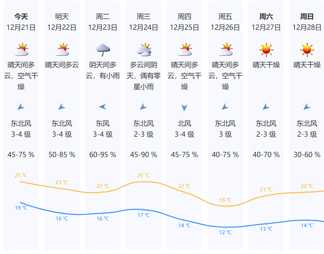 据@广东天气 预计,21-22日,受北方弱冷空气南下影响,气温小幅下降,大部多云间晴。23日我省云量增多,部分市县有小雨。