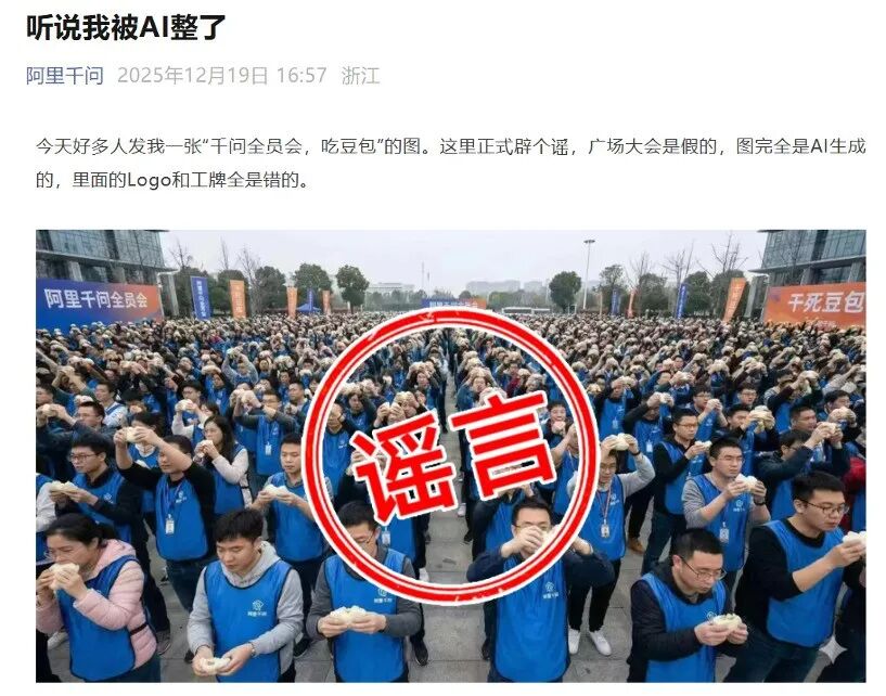 对此,今天下午,千问App官方微信公众号“阿里千问”正式辟谣:图片完全是AI生成的,是假的。