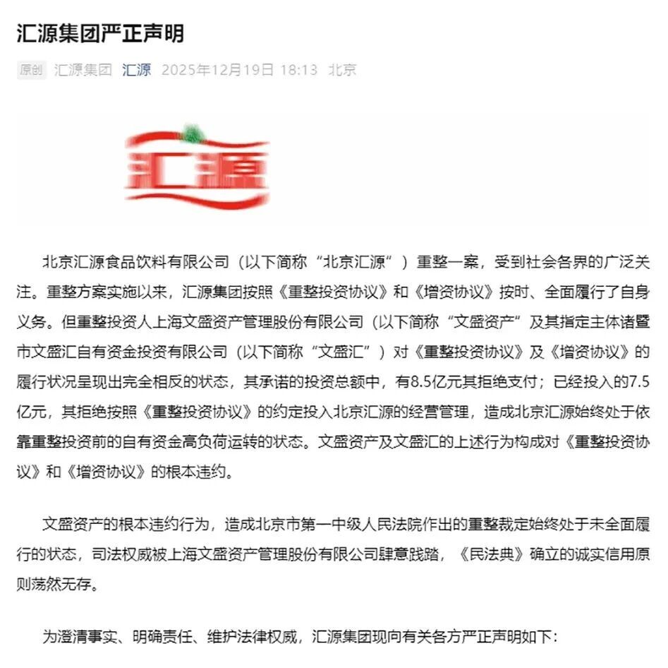 12月19日,汇源集团发布声明称,重整方案实施以来,汇源集团按照《重整投资协议》和《增资协议》按时、全面履行了自身义务。但重整投资人上海文盛资产管理股份有限公司(以下简称“文盛资产”)及其指定主体诸暨市文盛汇自有资金投资有限公司(以下简称“文盛汇”)对《重整投资协议》及《增资协议》的履行状况呈现出完全相反的状态,其承诺的投资总额中,有8.5亿元其拒绝支付;已经投入的7.5亿元,其拒绝按照《重整投资协议》的约定投入北京汇源的经营管理,造成北京汇源始终处于依靠重整投资前的自有资金高负荷运转的状态。