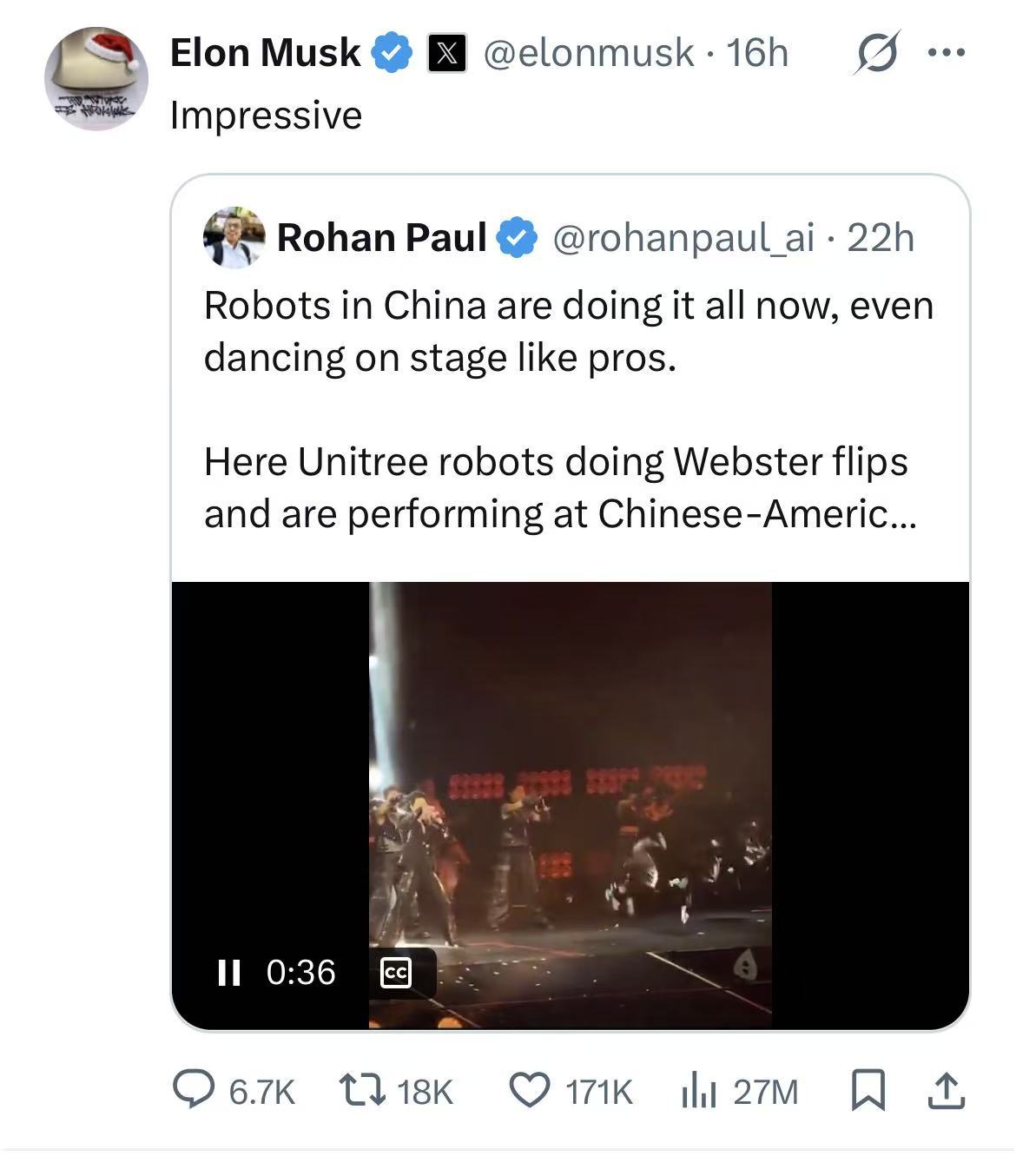 12月18日至21日,王力宏“最好的地方”巡回演唱会成都站举行。本轮演唱会,王力宏演唱代表作《火力全开》。宇树机器人在歌曲中伴舞片段得到了特斯拉CEO埃隆·马斯克的转发点赞,引发海内外社交媒体热议。