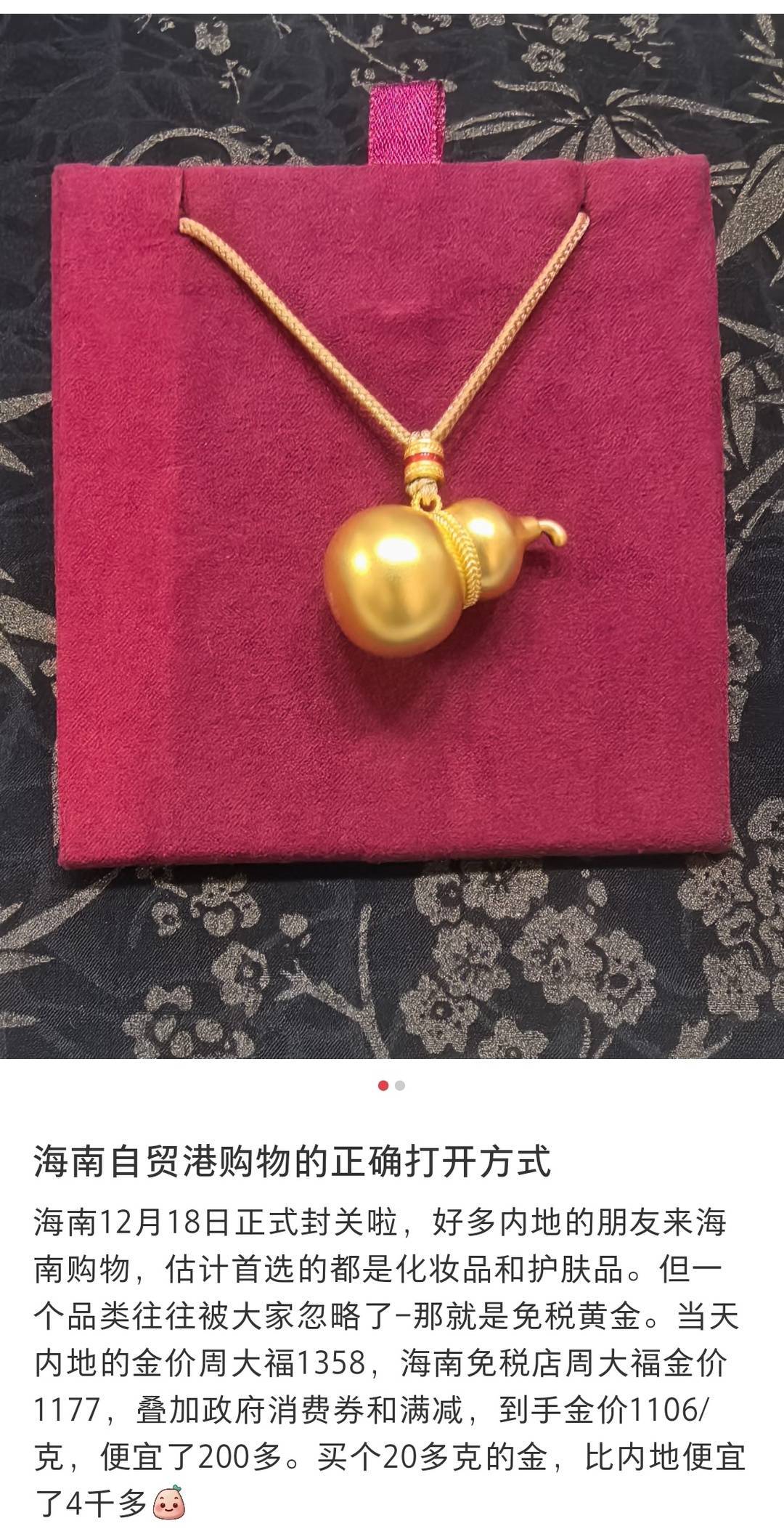 如今在社交媒体搜索“海南黄金”,各类“自贸港购物黄金攻略”已刷屏网络。封关首日,各大免税店的黄金柜台前便排起长队,游客们手持计算器仔细核算价差。广东游客周女士分享了自己的购物体验:她所在的城市周大福金价达1358元/克,海南免税店同品牌金价仅1177元/克,叠加政府消费券和满减活动后,到手价低至1106元/克,单克价差超200元。“买一件20多克的金饰,直接省下4000多元,太划算了。”