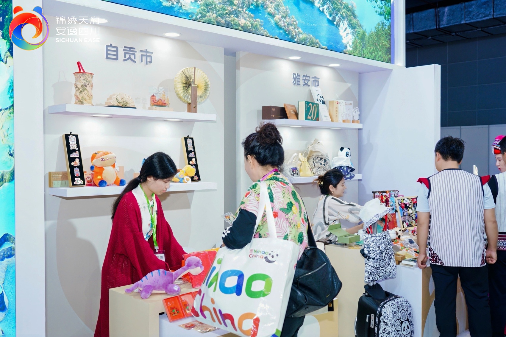 本届旅交会以“中国自贸港 世界度假岛”为主题,设五大特色展区,四川展厅以“锦绣天府 安逸四川”为主题打造沉浸式体验空间。自贡展位集中陈列灯具、公仔等多品类文创产品,同步推出美食试吃活动,生动展现“千年盐都、恐龙之乡、中国灯城、美食之府”的独特魅力,吸引众多观众驻足打卡。