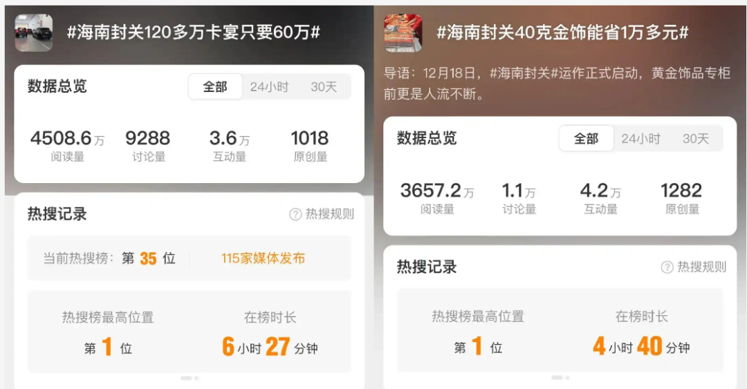 12月20日,“海南封关120多万卡宴只要60万”“海南封关40克金饰能省1万多元”等话题冲上热搜榜第一,引发网友热议。