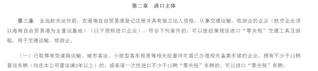 同时,车辆必须确保始发地及目的地至少一端在海南自由贸易港内,且每年在中国内地停留时间累计不超过120天(按日计算,不计次数)。而且即便是企业购买,还得满足条件:取得享惠主体资格的企业,连续营运3年以上且拥有不少于15辆营运3年以上车辆的,或一次性进口10辆以上“零关税”车辆的,可再次进口“零关税”车辆。接受“零关税”进口车辆转入的享惠主体,须具备再次进口“零关税”车辆的条件。