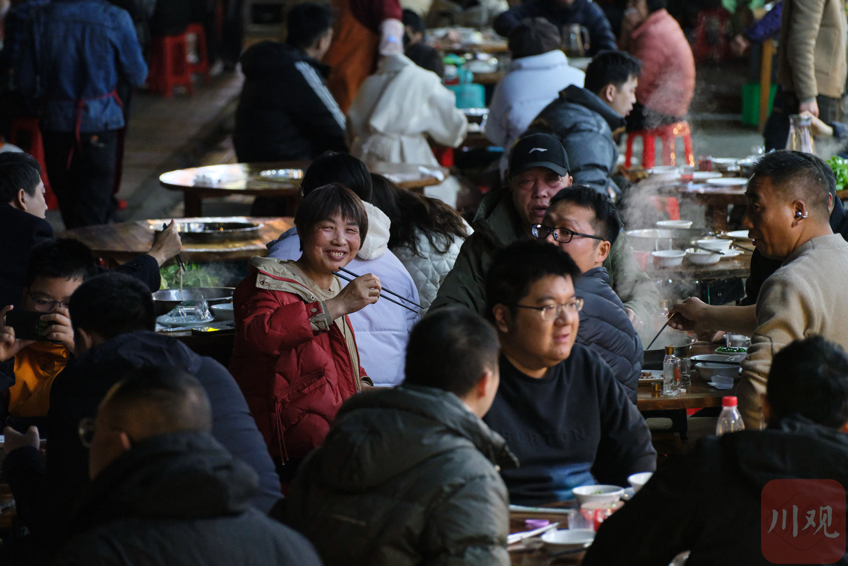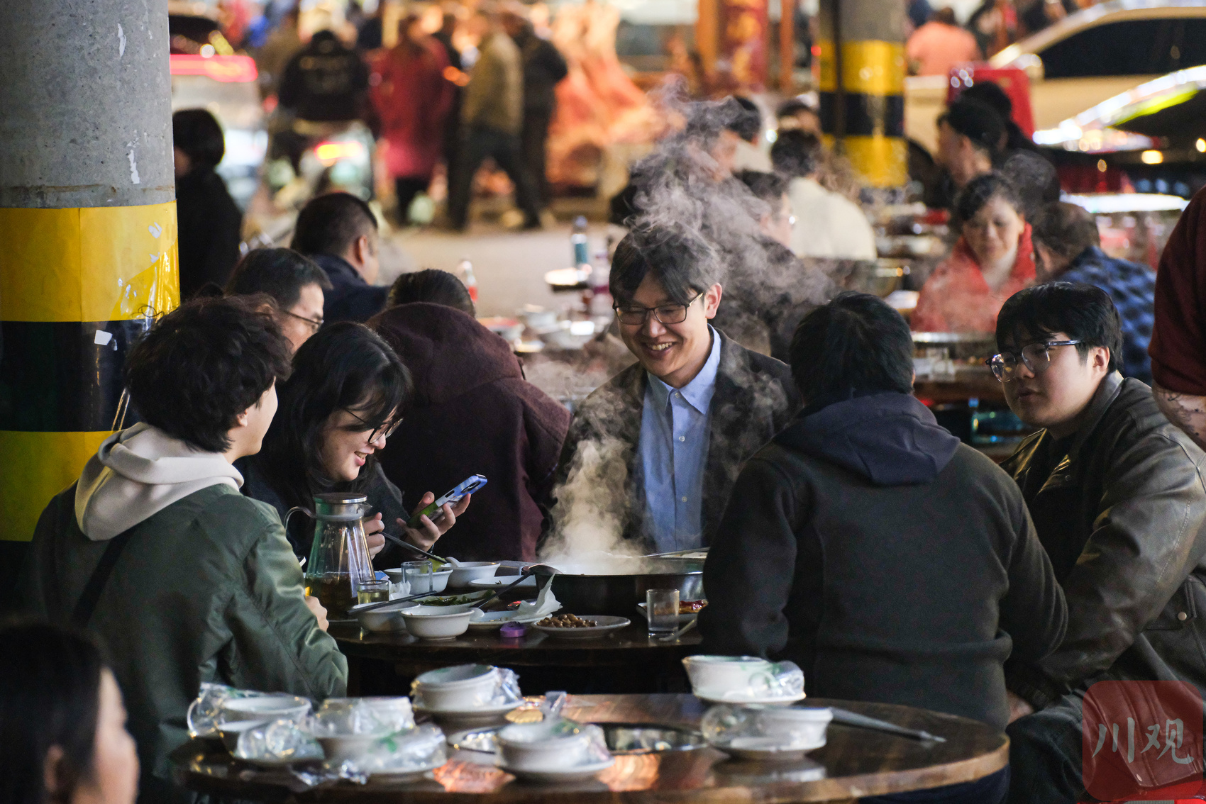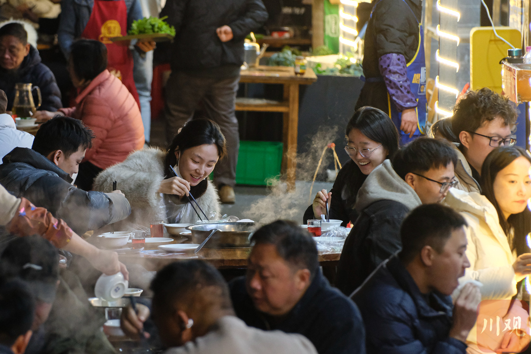 小关庙羊肉汤一条街上,顾客围坐用餐,在夜色中感受冬至的烟火气。