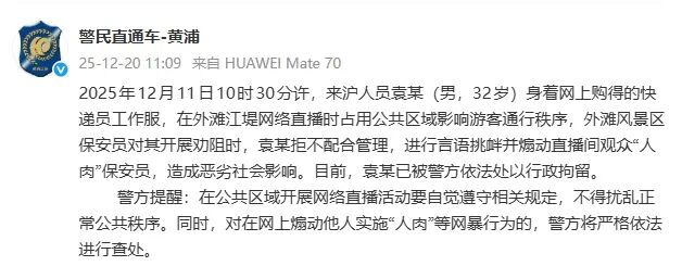 12月11日10时30分许,来沪人员袁某(男,32岁)身着网上购得的快递员工作服,在外滩江堤网络直播时占用公共区域影响游客通行秩序,外滩风景区保安员对其开展劝阻时,袁某拒不配合管理,进行言语挑衅并煽动直播间观众“人肉”保安员,造成恶劣社会影响。目前,袁某已被警方依法处以行政拘留。