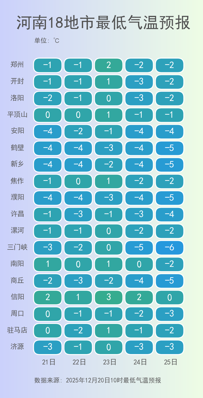 在冷空气的接连打压下,未来五天河南的气温将频繁出现波动,其中今天和下周二的最高气温相对处在高位,大部地区在10~15℃,其余时间仅有个位数。最低气温则会持续低迷,基本都在冰点以下,早晚寒意十足,大家出门一定要穿厚些,谨防感冒。