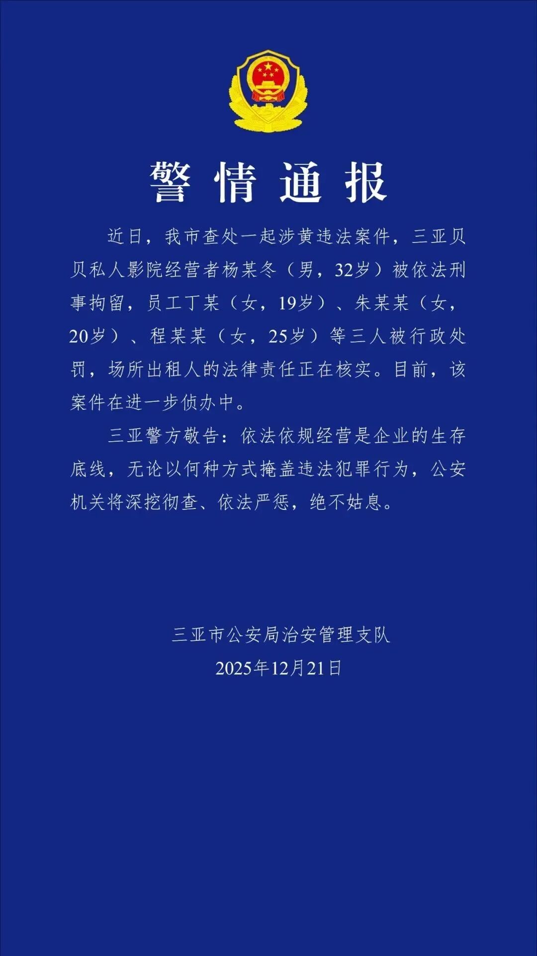 三亚市公安局治安管理大队12月21日通报,近日,三亚市查处一起涉黄违法案件,三亚贝贝私人影院经营者杨某冬(男,32岁)被依法刑事拘留,员工丁某(女,19岁)、朱某某(女,20岁)、程某某(女,25岁)等三人被行政处罚,场所出租人的法律责任正在核实。目前,该案件在进一步侦办中。