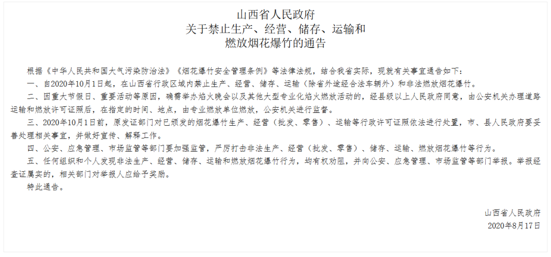 该通告当时表示,自2020年10月1日起,在山西省行政区域内禁止生产、经营、储存、运输(除省外途经合法车辆外)和非法燃放烟花爆竹。