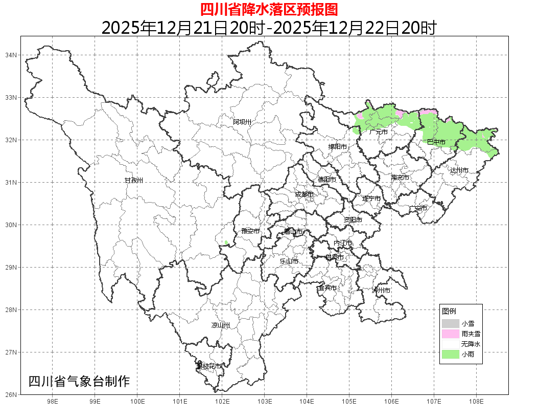 21日晚上到22日白天:盆地大部多云转阴,广元、巴中和达州3市北部有小雨或阵雨,高海拔山区有雨夹雪;川西高原和攀西地区晴间多云。