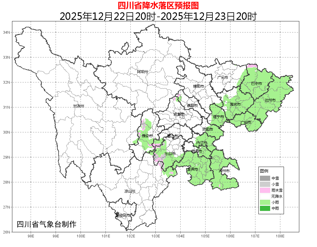 22日晚上到23日白天:盆地西北部阴天转多云,其余地方阴天有小雨或阵雨,高海拔山区有雨夹雪,北部中部有4-6级偏北风,局地7级以上;川西高原和攀西地区晴间多云。