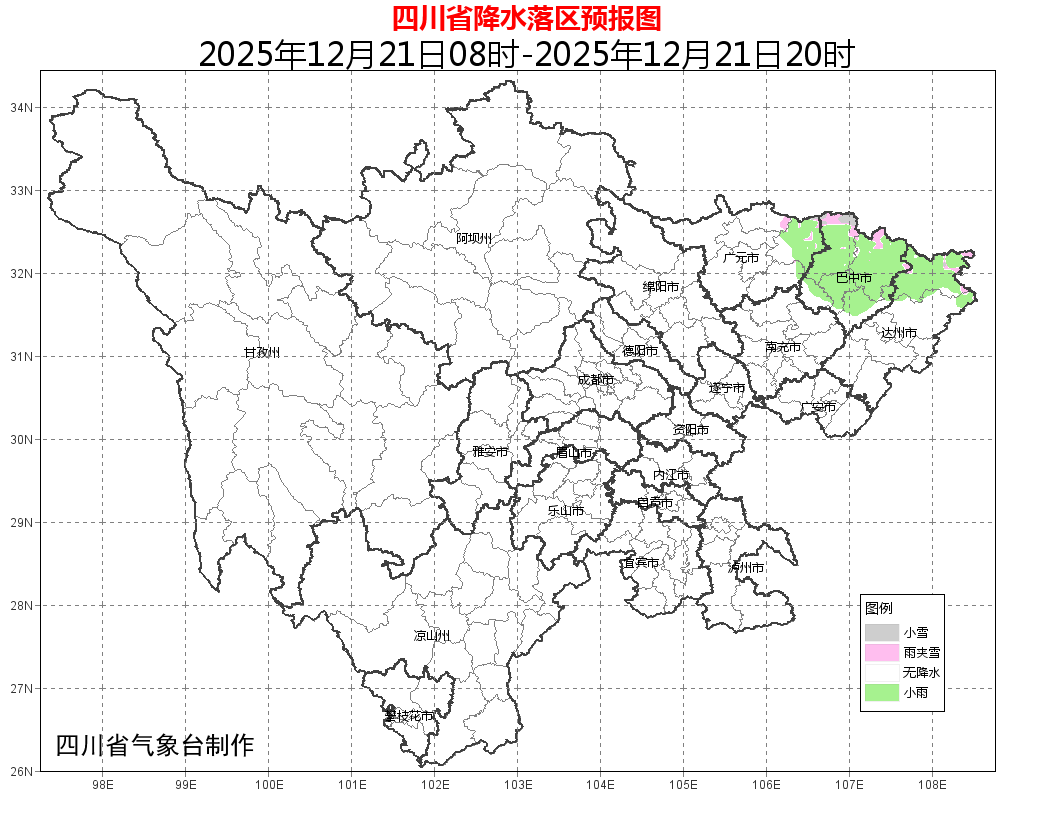 今天白天:巴中、达州北部和广元东部阴天间多云有小雨或阵雨,高海拔山区有雨夹雪,盆地其余地方多云间晴;川西高原和攀西地区多云间晴。