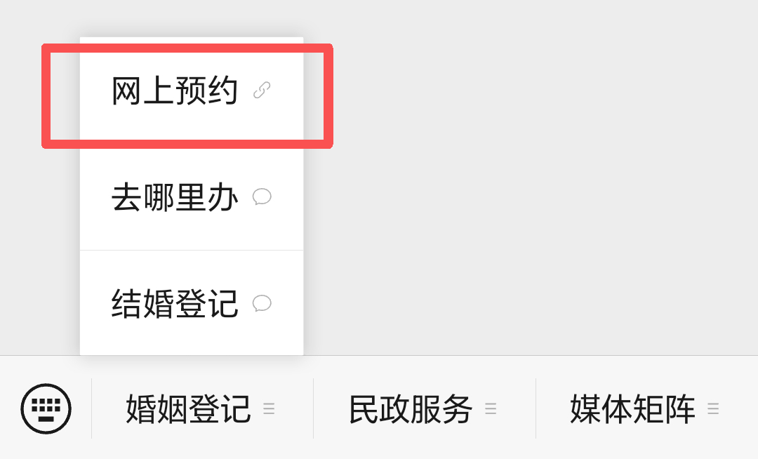 “成都民政”微信公众号——“婚姻登记”菜单栏