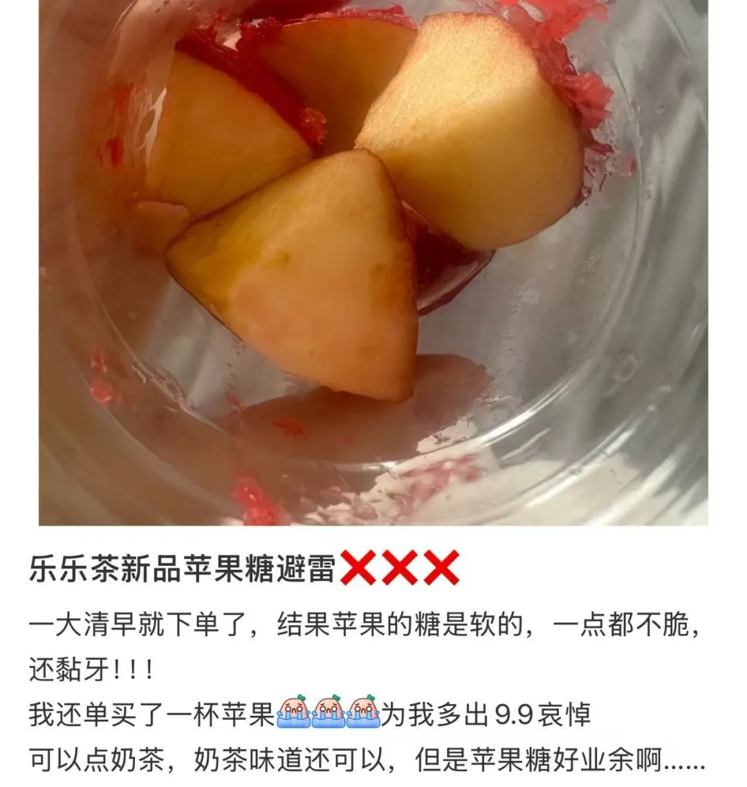据此前报道,有多名网友发帖称知名奶茶品牌乐乐茶的新品“苹果糖”不好喝:“一口下去牙冠都要被粘下来了。”
