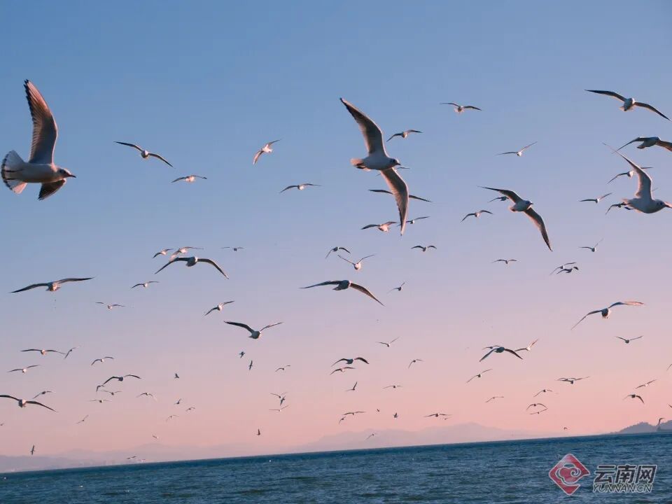 落日的余晖洒在滇池的水面,海鸥与晚风相拥、潮水轻拍堤岸。昆明的傍晚,夕阳渐隐西山,留下了漫天的晚霞,滇池与鸥群在晚霞的映照下,构成了一幅流动的天然画卷。
