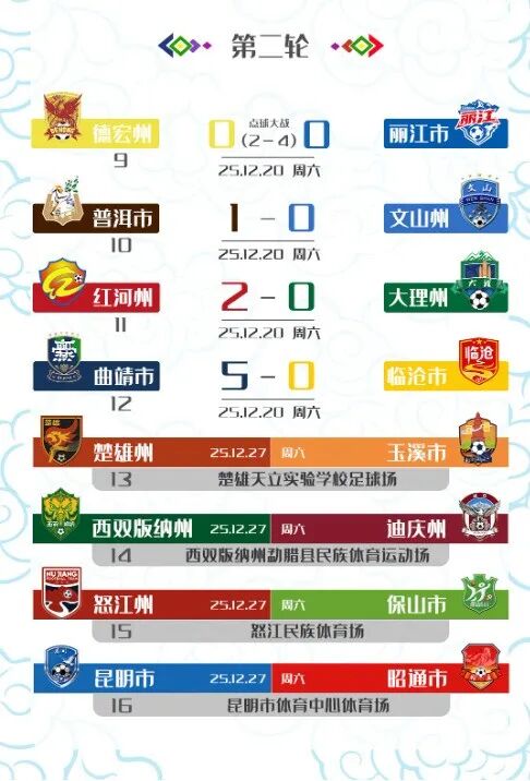 12月20日,滇超联赛第二轮打响。首轮登顶的丽江队客场挑战德宏队,德宏队凭借顽强防守将比赛拖入点球大战,最终丽江队展现强队底蕴以4:2胜出,客场斩获2分;普洱队迎来赛季首个主场,9号李镇秦点球命中并实现连场破门,帮助球队1:0力克文山队,顺利拿下3分;红河队主场发力,25号杨世福折射破门打破僵局,30号李杰补时反击锁定胜局,2:0完胜大理队豪取两连胜;曲靖队回归主场后攻势如虹,9号赵奕豪开场连入两球,38号李科、18号张晓波、41号余杰迪先后建功,最终5:0横扫临沧队,全取3分。