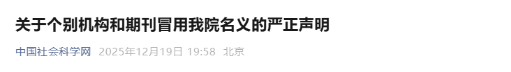 中国社会科学院科研局于12月19日发布“严正声明”称,近期,多家非我院隶属机构或期刊冒用我院名义,违规举办学术会议、组织培训、召开新闻发布会、征集学术文章,甚至向社会公众推荐理财产品,严重损害我院声誉并可能给社会公众造成财产损失。