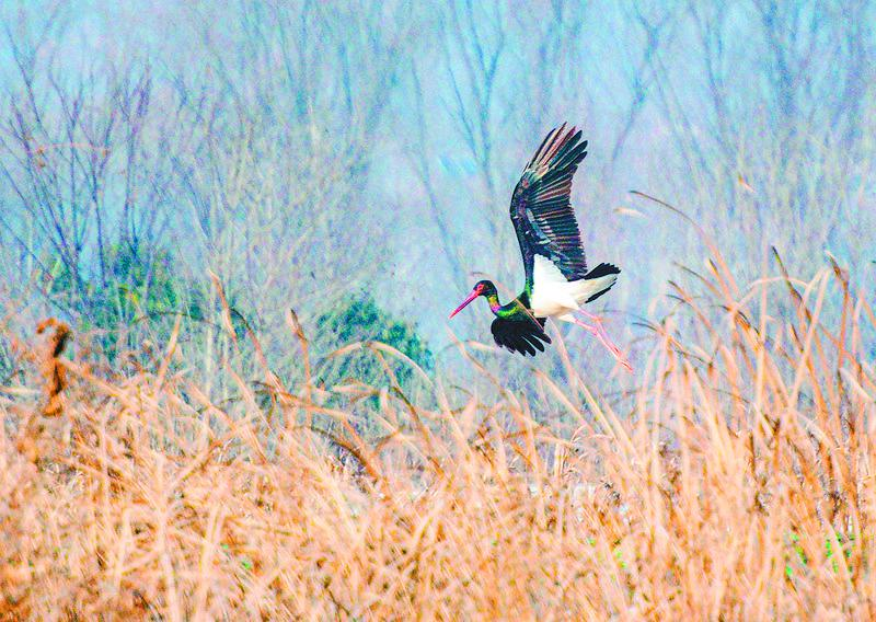 冬日的西安市长安区王曲街道十里蛤蟆滩,微凉的风掠过稻田,还裹挟着稻茬留存的清新气息。12月20日,记者跟随鸟友的脚步走进稻花乡里农业园区,刚踏上田埂,就被眼前的景象惊艳——连片的稻田里,水洼泛着粼粼波光,一群红嘴红腿、身披黑羽的鸟儿正低头觅食,偶尔展翅盘旋,背部绿紫色的金属光泽和腹部的白羽在暖阳下格外醒目。“这就是黑鹳!咱这儿的常客。”园区工作人员笑着向记者介绍。