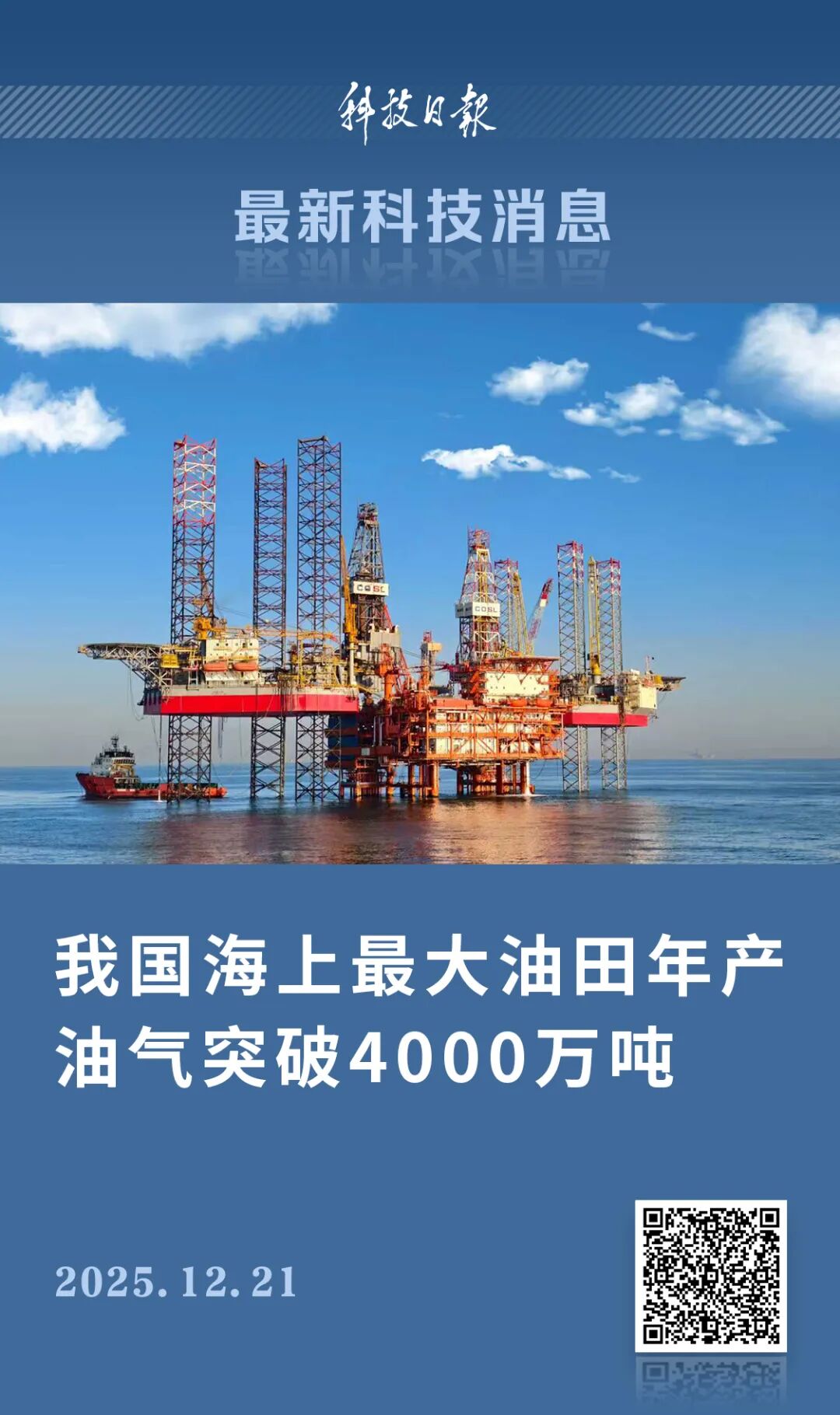 12月21日,中国海油对外宣布,我国海上最大油田——渤海油田2025年累计生产油气当量突破4000万吨,创历史新高。