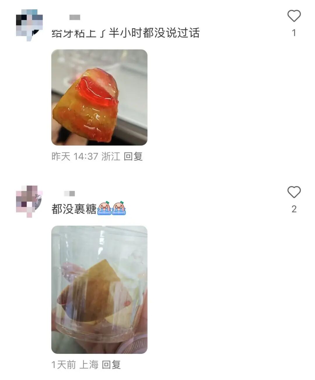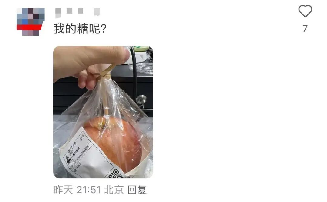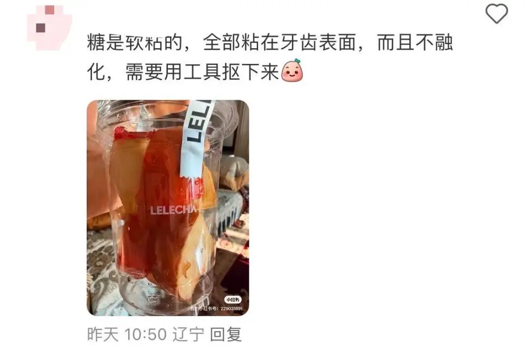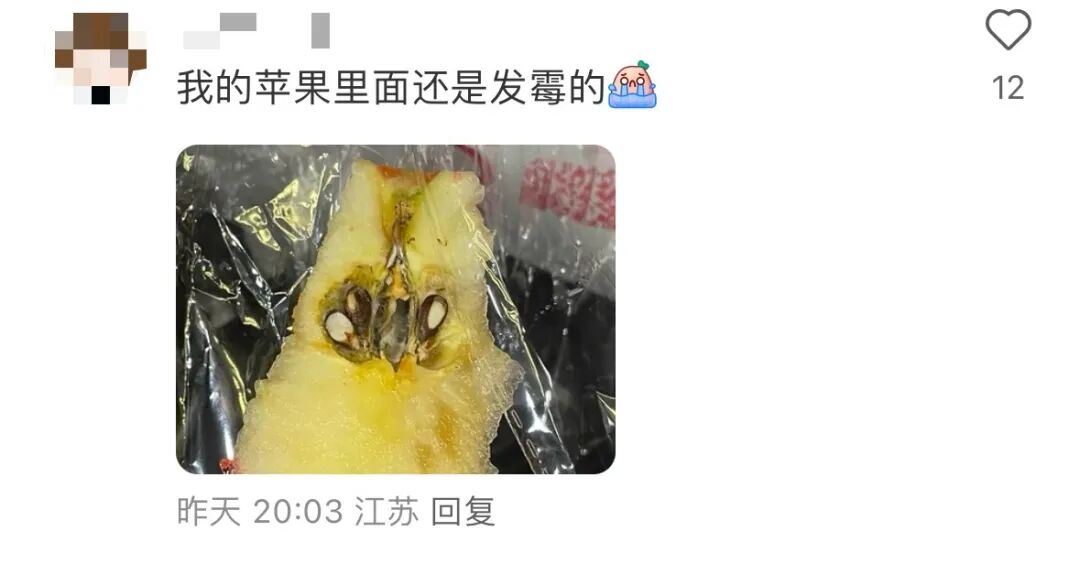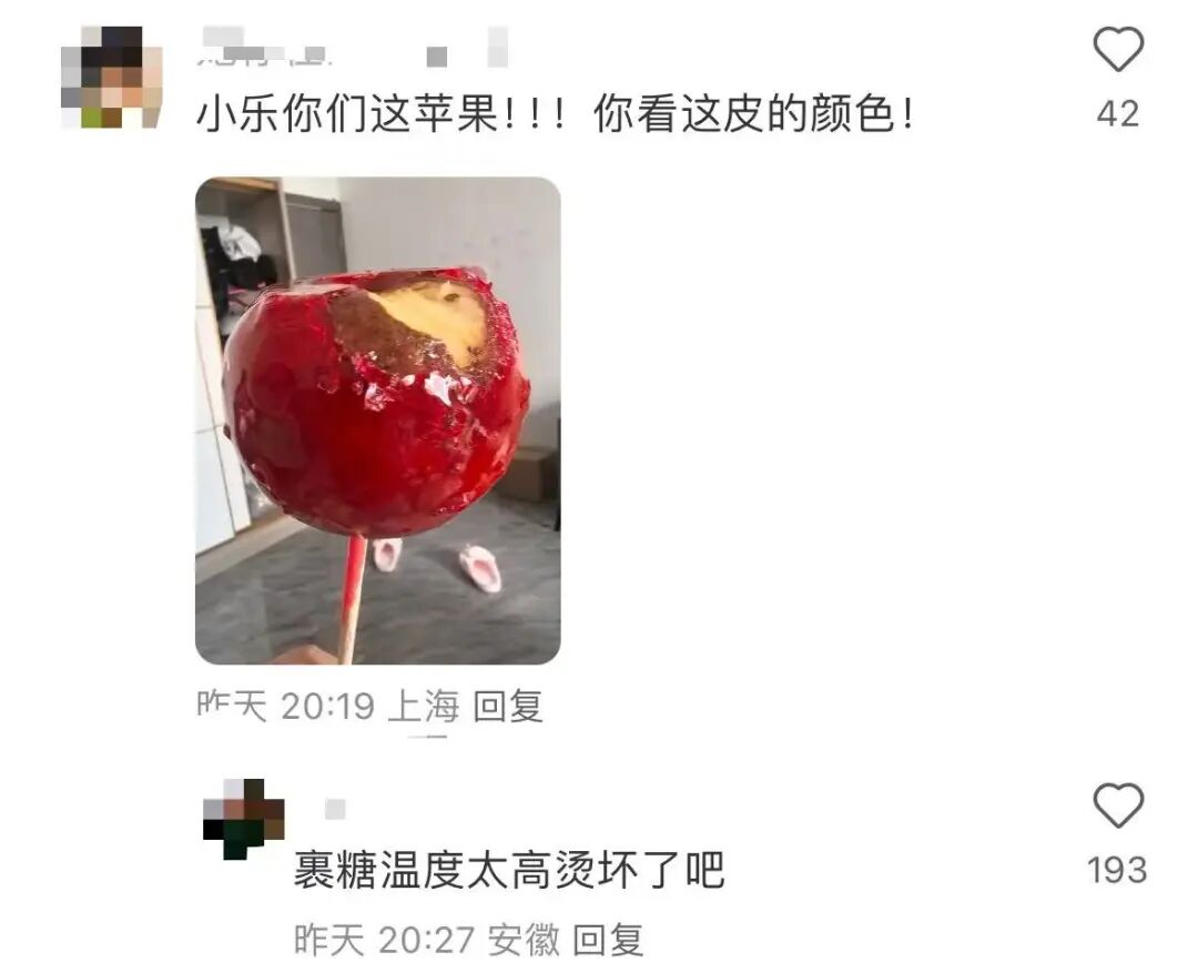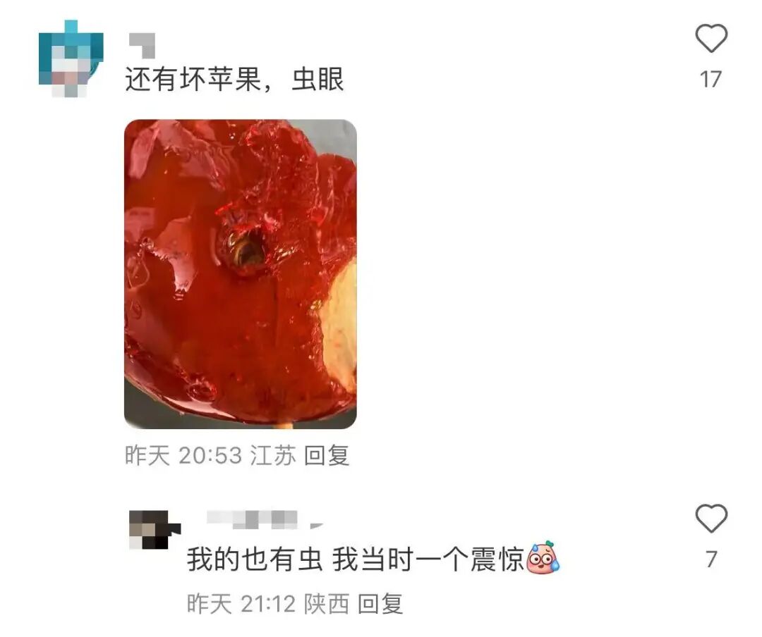 网友吐槽称糖太粘牙,还有人反映“收到的苹果没有裹糖”“苹果有虫眼、发霉”等。