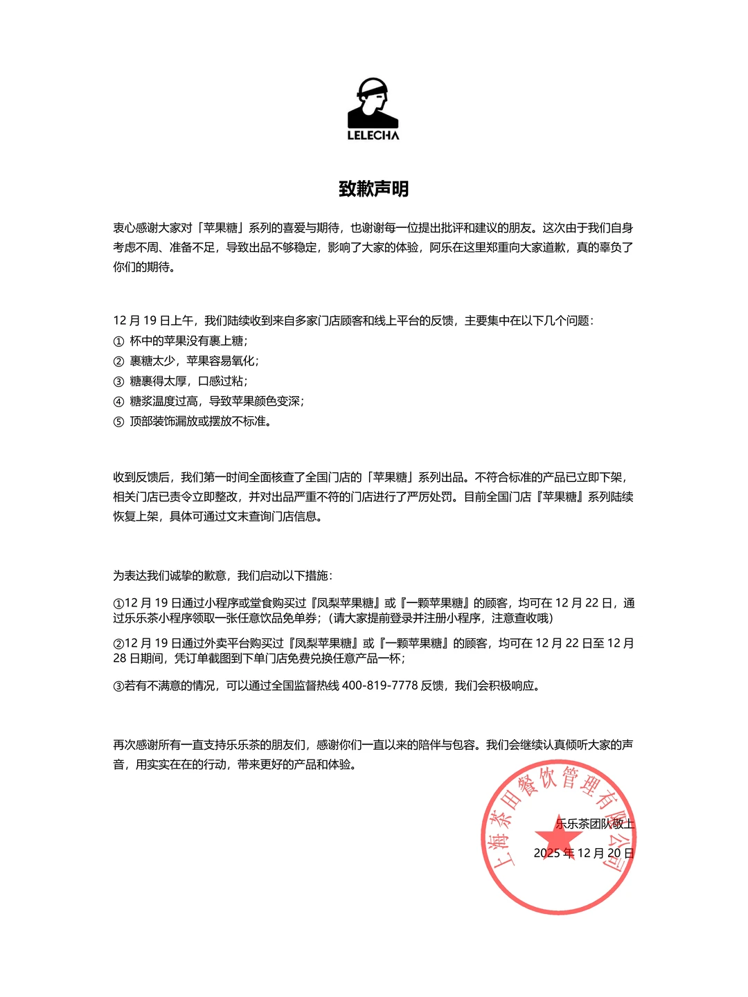 昨晚(12月20日),乐乐茶官方发布致歉声明:
