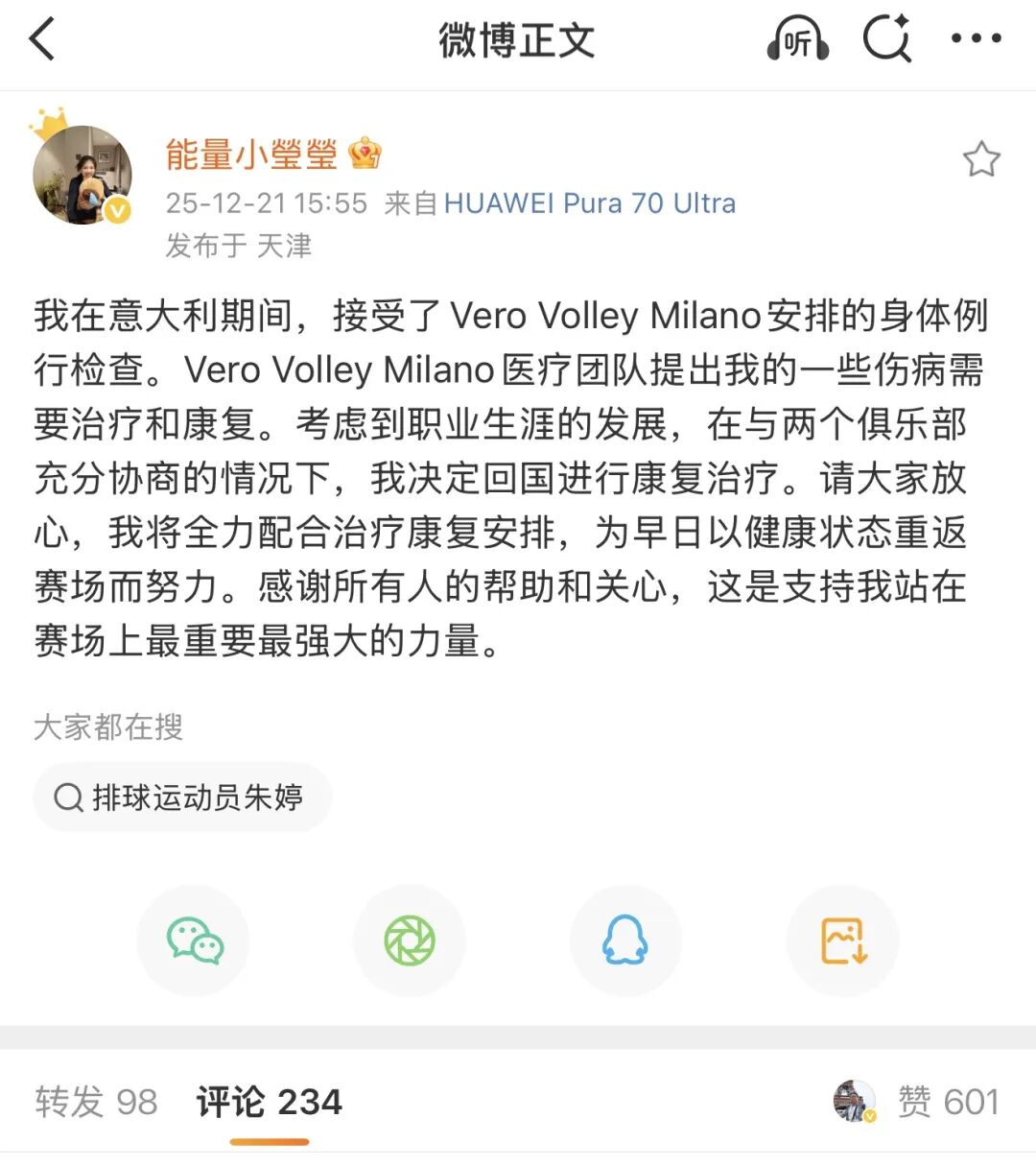 北京时间2025年12月21日下午,天津渤海银行女排官方微博以及李盈莹本人分别发表声明,目前李盈莹因为伤病问题已从米兰返回天津,天津渤海银行女排俱乐部将为李盈莹安排最好的医疗和康复条件,确保她尽快恢复,早日重返赛场。