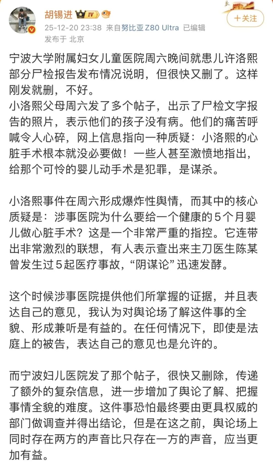 12月20日晚,@胡锡进 为小洛熙事件发声: