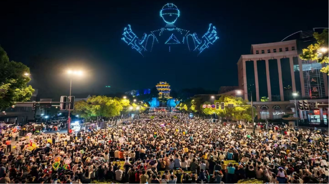 国潮醒狮腾跃助兴,灵动鱼灯次第巡游,更有赛博麒麟酷炫登场,传统韵味与未来感交织,每一步都是视觉盛宴。夜幕降临,2026架无人机将升空组成璀璨光影矩阵,搭配民乐、流行歌曲、B-Box,各种旋律将氛围感拉满。