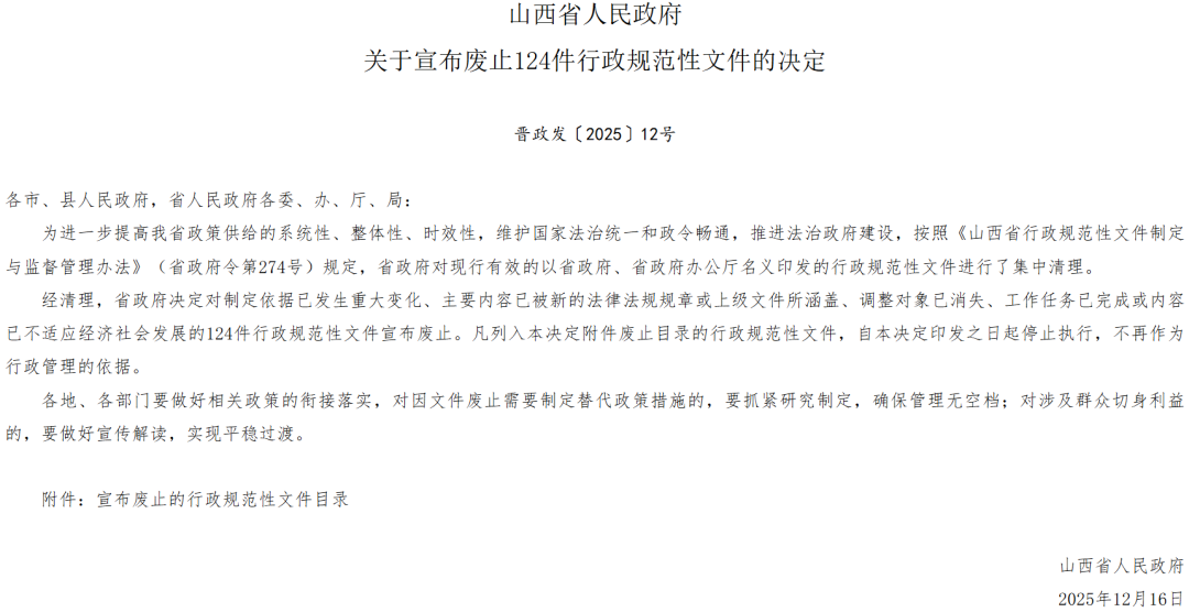 近日,山西省人民政府网发布关于宣布废止124件行政规范性文件的决定,决定表示,经清理,省政府决定对制定依据已发生重大变化、主要内容已被新的法律法规规章或上级文件所涵盖、调整对象已消失、工作任务已完成或内容已不适应经济社会发展的124件行政规范性文件宣布废止。凡列入本决定附件废止目录的行政规范性文件,自本决定印发之日起停止执行,不再作为行政管理的依据。