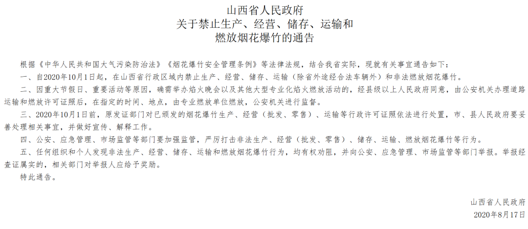 该通告当时表示,自2020年10月1日起,在山西省行政区域内禁止生产、经营、储存、运输(除省外途经合法车辆外)和非法燃放烟花爆竹,因重大节假日、重要活动等原因,确需举办焰火晚会以及其他大型专业化焰火燃放活动的,经县级以上人民政府同意,由公安机关办理道路运输和燃放许可证照后,在指定的时间、地点,由专业燃放单位燃放,公安机关进行监督。