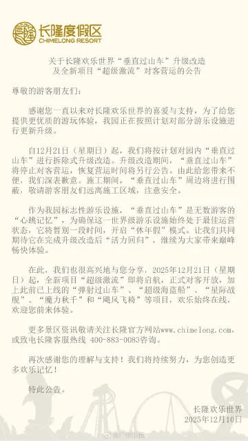 南都此前报道,广州长隆欢乐世界于2006年4月7日开园,是集乘骑游乐、文化演艺、花车巡游、特色餐饮和文创商品销售等综合服务于一体的超大型主题游乐园。