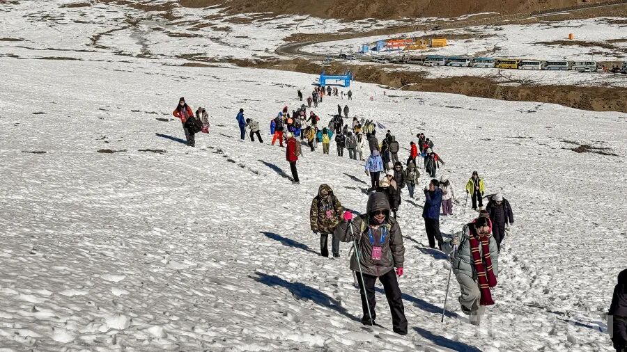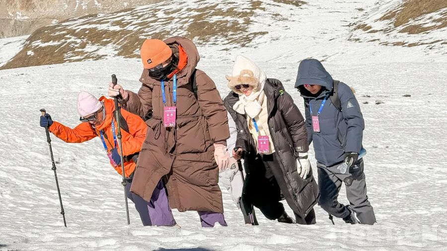 上午,随着出发号令响起,队伍在专业高山向导的带领下有序前行。参与者们运用“三层穿衣法”有效御寒,借助登山杖、防滑冰爪等专业装备稳健踏雪。途中,向导不仅全程监护安全,实时提示高海拔适应知识与冰雪行走技巧,更将徒步变成了一堂生动的户外教学课。面对陡坡路段,大家自发组成“互助小队”,彼此搀扶、鼓励加油,原本陌生的面孔在并肩前行中迅速熟络,团队的温暖与凝聚力在寒风中悄然升腾。不少人放慢脚步,用镜头记录下“随手拍即是大片”的壮丽景致,或与同伴在雪地上留下创意合影,欢声笑语回荡在静谧的山谷之间。