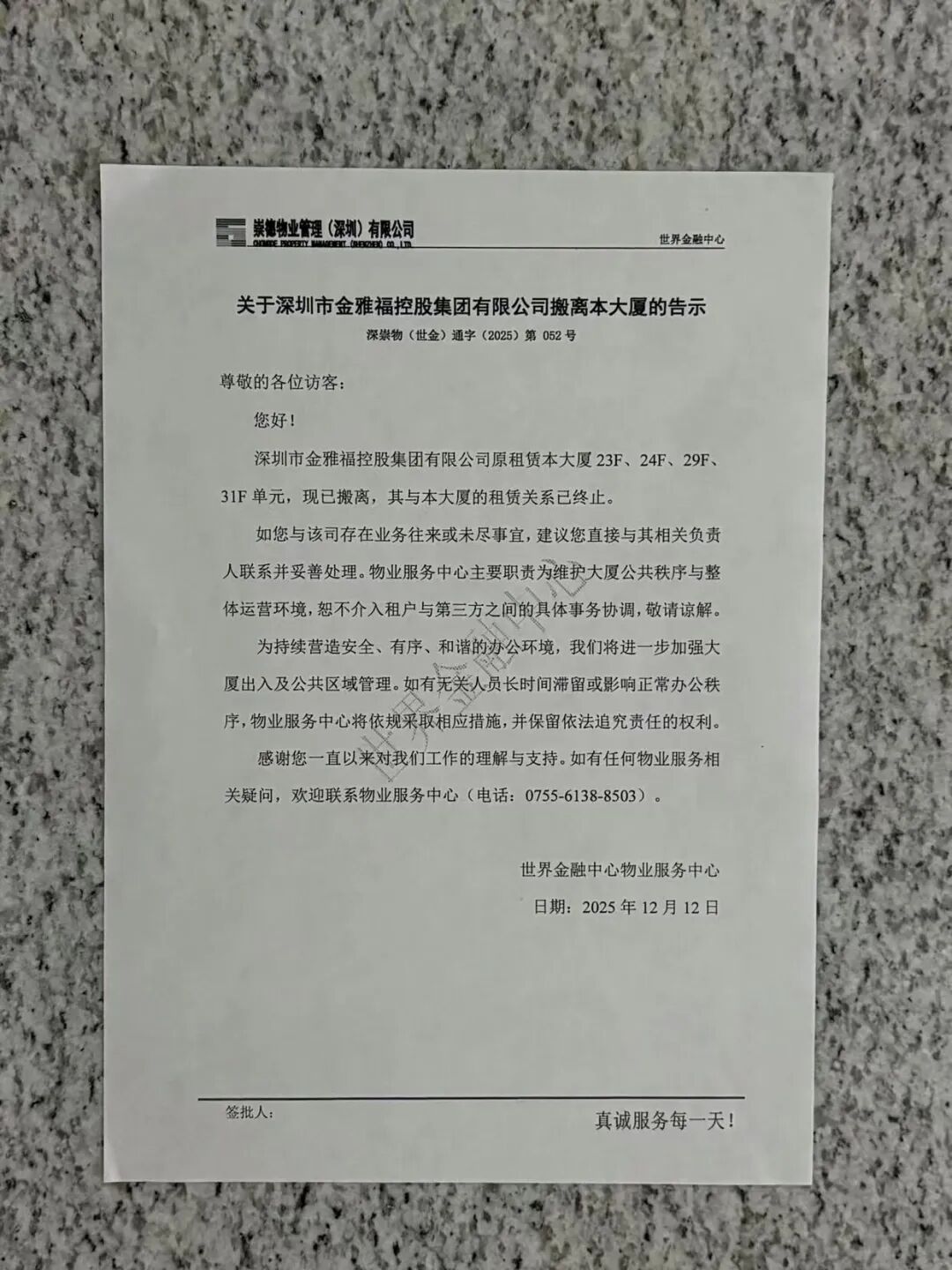 在办公室门前,落款日期为12月12日的物业中心告示称,金雅福已搬离,与大厦租赁关系终止。