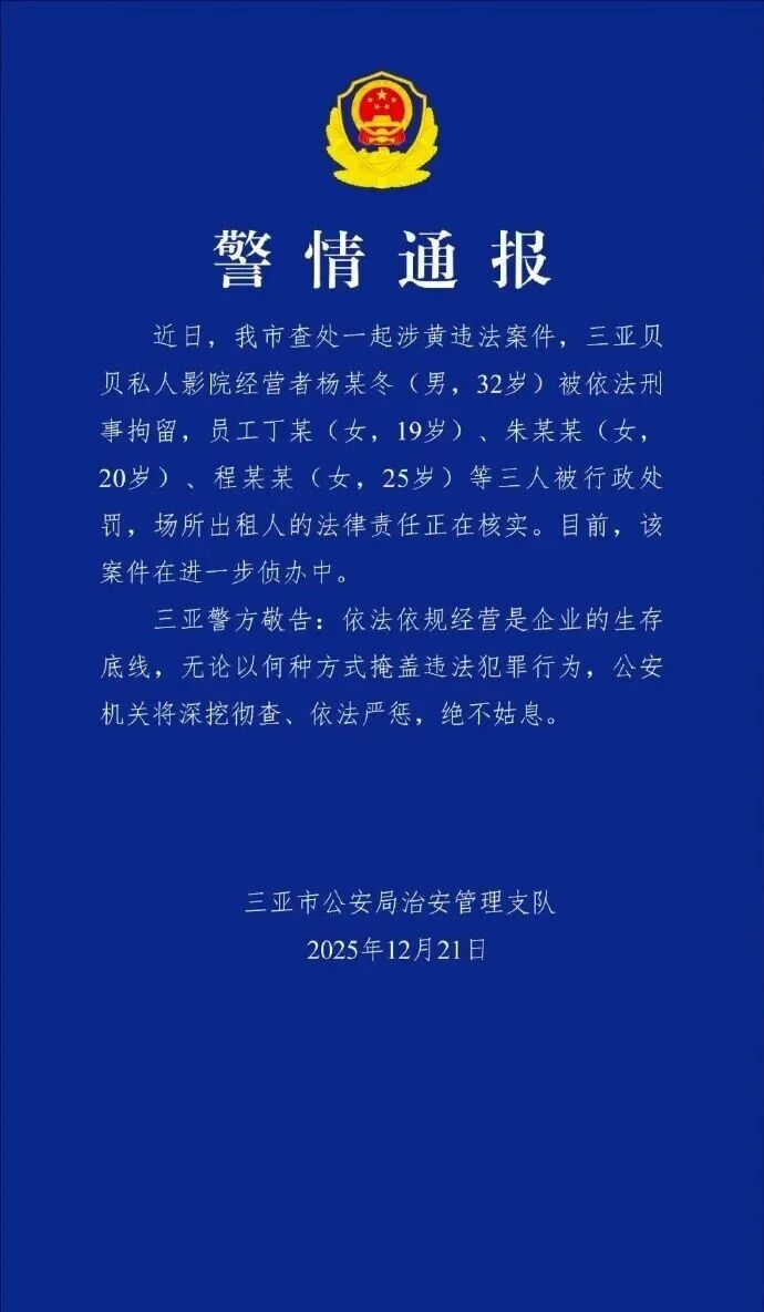 近日,我市查处一起涉黄违法案件,三亚贝贝私人影院经营者杨某冬(男,32岁)被依法刑事拘留,员工丁某(女,19岁)、朱某某(女,20岁)、程某某(女,25岁)等三人被行政处罚,场所出租人的法律责任正在核实。目前,该案件在进一步侦办中。