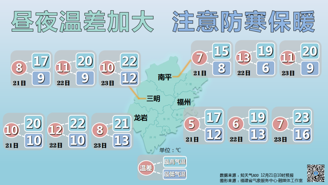 如昨天省会福州最高气温还有26.3℃,今天降至17℃。气温波动频繁,升降温幅度较大。