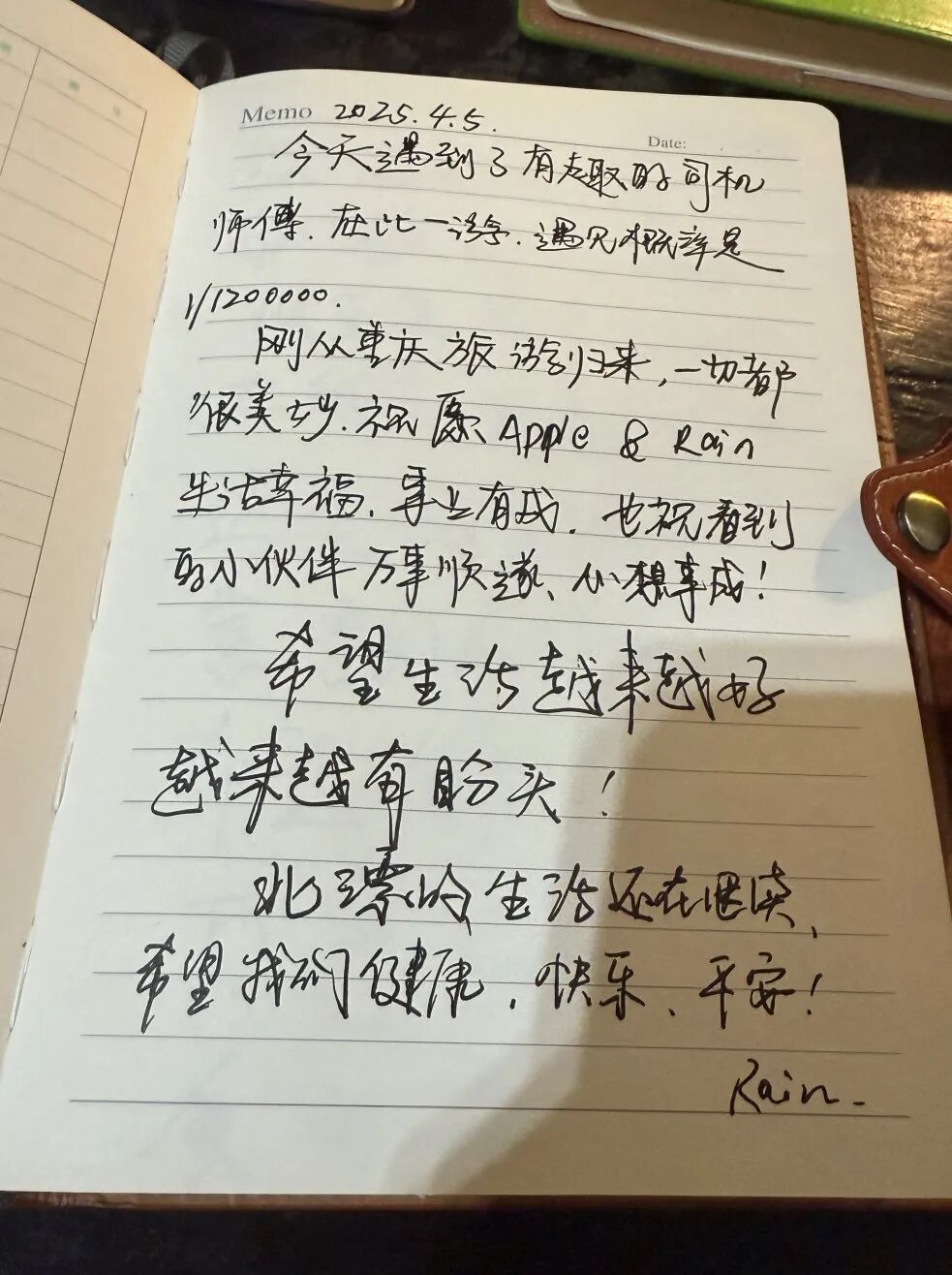 这本留言本不仅治愈了乘客,也成为反哺杨永壮心灵的解药。“以前觉得开网约车就是赚钱养家,每天机械地接单、送客,心里空荡荡的。”现在,他在乘客的故事里看到了自己闯荡的影子:那位来自内蒙古的乘客,和丈夫靠刷信用卡凑首付买房,与两个孩子分隔两地,连11块钱的面条都舍不得吃,却在留言本上写下“日子再难,也会越来越好”;那位患脑瘤的00后女孩,坦然写下“我活不久了”,字里行间却满是乐观和对生活的热爱;还有无数普通职场人写下的“又加班啦,很累,但从本子里看到了别人的快乐,也摸到了希望”“下班快乐,我辛苦了”……