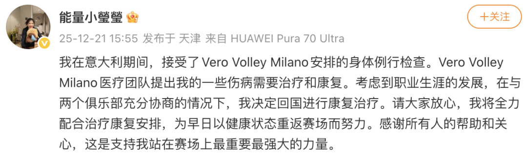 李盈莹表示,“我在意大利期间,接受了Vero Volley Milano(米兰俱乐部)安排的身体例行检查。Vero Volley Milano医疗团队提出我的一些伤病需要治疗和康复。考虑到职业生涯的发展,在与两个俱乐部充分协商的情况下,我决定回国进行康复治疗。请大家放心,我将全力配合治疗康复安排,为早日以健康状态重返赛场而努力。”