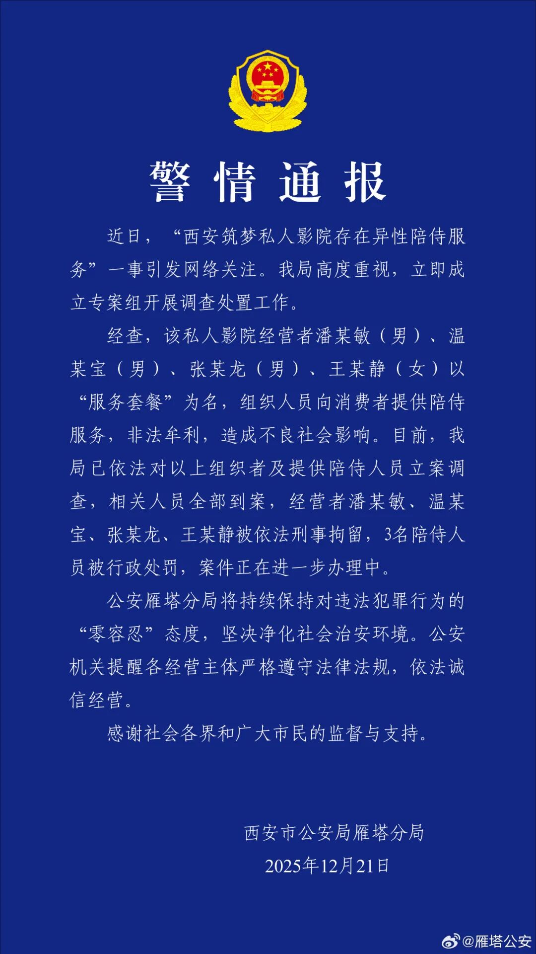 12月21日,西安市公安局雁塔分局通报“一私人影院存在异性陪侍服务”,全文如下: