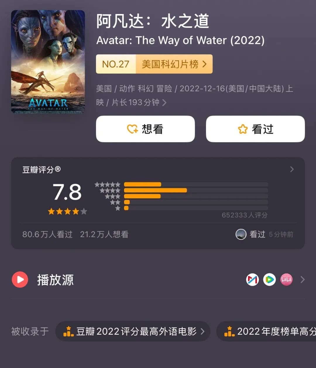 记者查询发现,2022年《阿凡达2:水之道》豆瓣7.8分/IMDb7.5分,2009年《阿凡达1》豆瓣8.8分/IMDb7.9分。