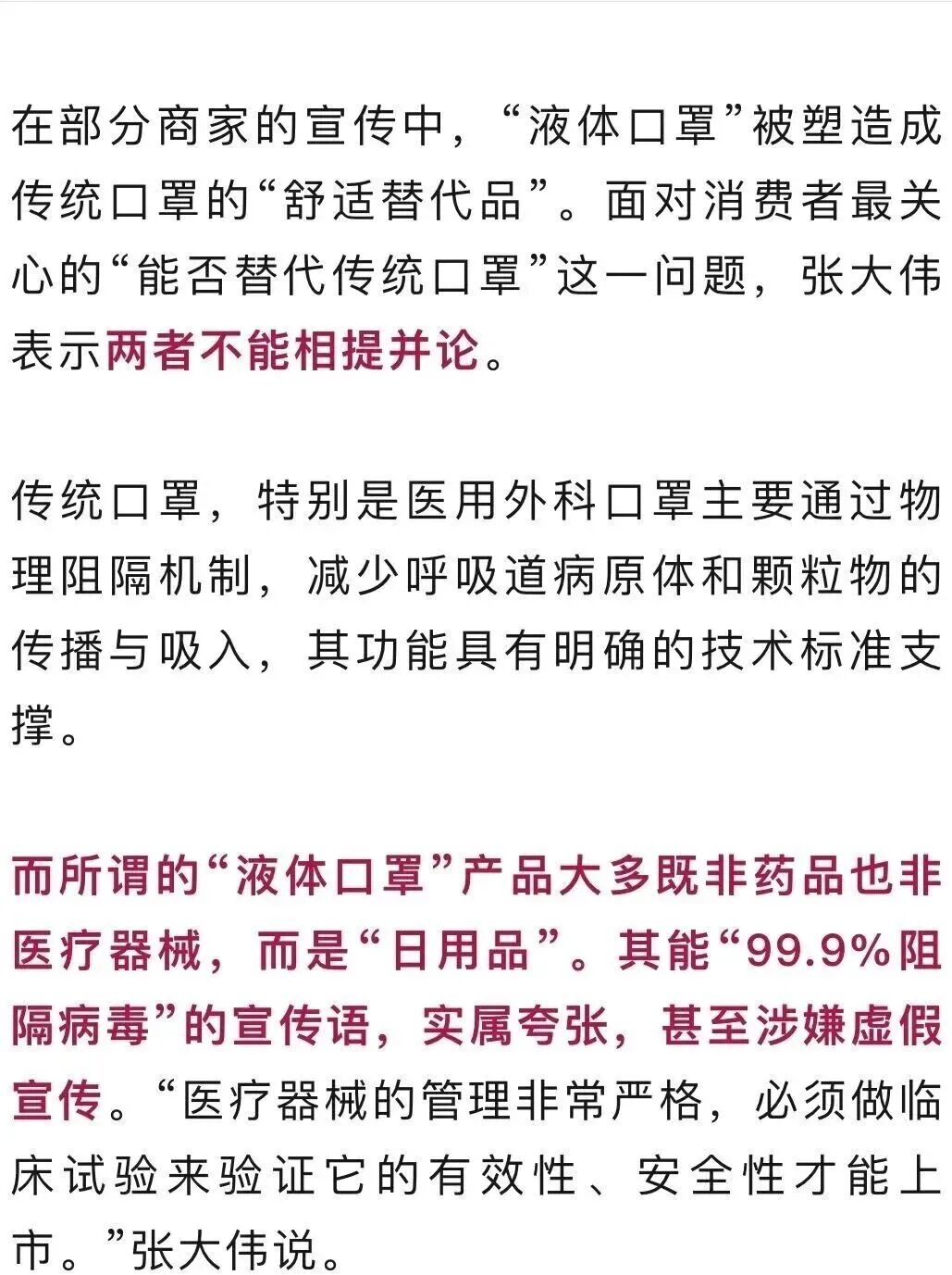 张大伟表示,所谓“液体口罩”的作用机制是否足够有效,需满足与鼻黏膜充分接触、防护膜持续有效等多个条件。