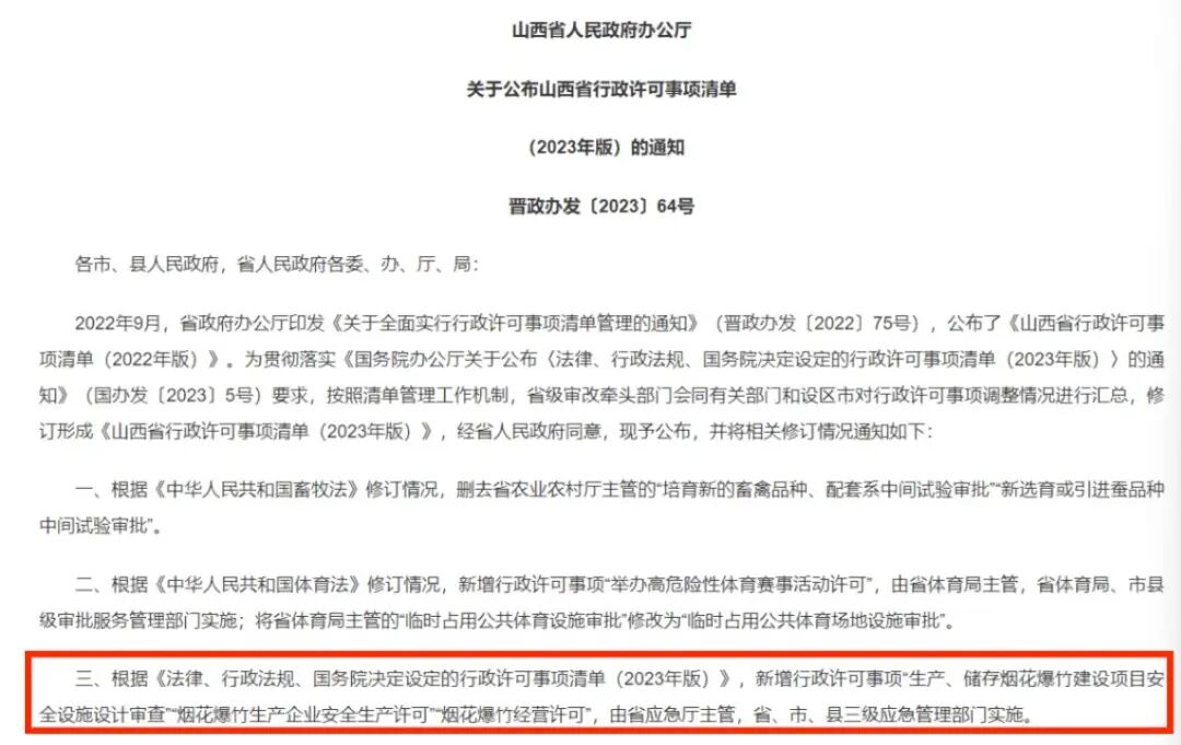 据山西当地媒体此前报道,山西省在烟花爆竹管理政策上以前已进行过调整,根据2023年11月9日发布的《山西省人民政府办公厅关于公布山西省行政许可事项清单(2023年版)的通知》,山西省新增了一系列与烟花爆竹相关的行政许可事项,标志着对这一传统文化元素的管理政策逐步松绑,新增的行政许可事项包括“生产、储存烟花爆竹建设项目安全设施设计审查”“烟花爆竹生产企业安全生产许可”以及“烟花爆竹经营许可”。这些许可事项由省应急厅主管,省、市、县三级应急管理部门负责实施。这一变化旨在强化对烟花爆竹产业的监管,保障生产、储存和经营过程中的安全。该公告意味着山西省对于烟花爆竹政策进行了更加细致和灵活的调整。