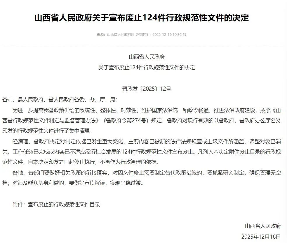 山西省人民政府关于宣布废止124件行政规范性文件的决定 来源:山西省人民政府网