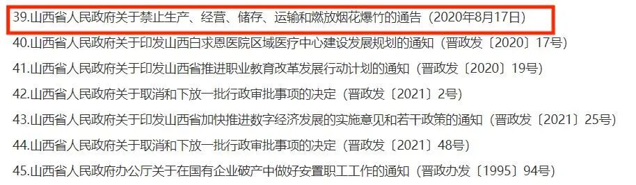 此前发布的《山西省人民政府关于禁止生产、经营、储存、运输和燃放烟花爆竹的通告》