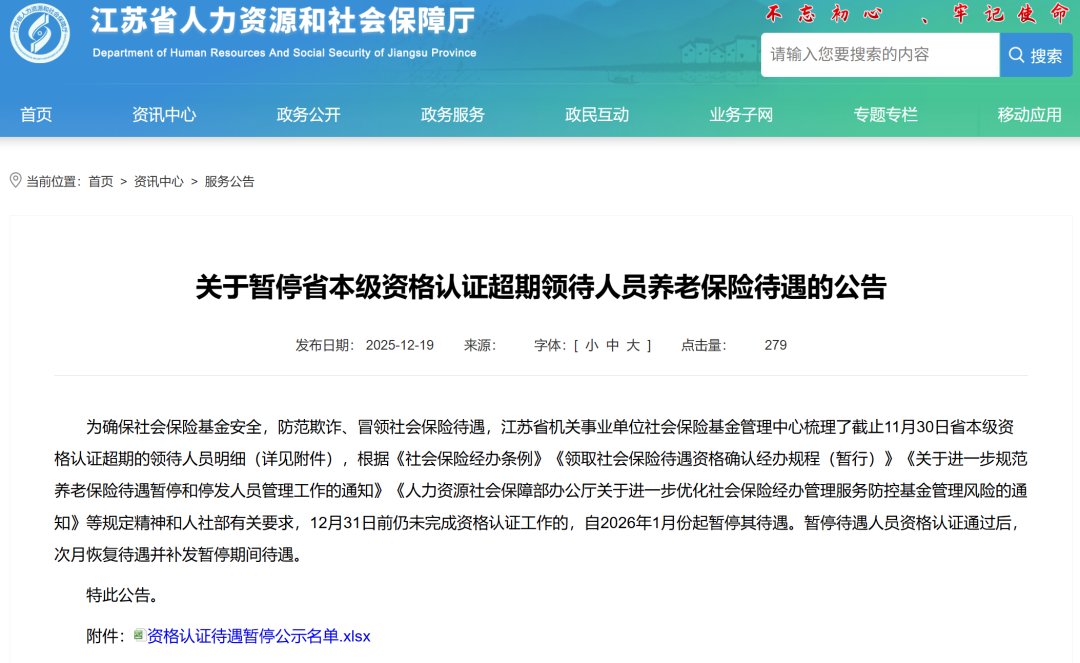 江苏省人社厅近日在官网公布将暂停2766位省本级资格认证超期领待人员养老保险待遇的公告。这些人员如果在12月31日前仍未完成资格认证工作,2026年1月起将被暂停发放待遇。
