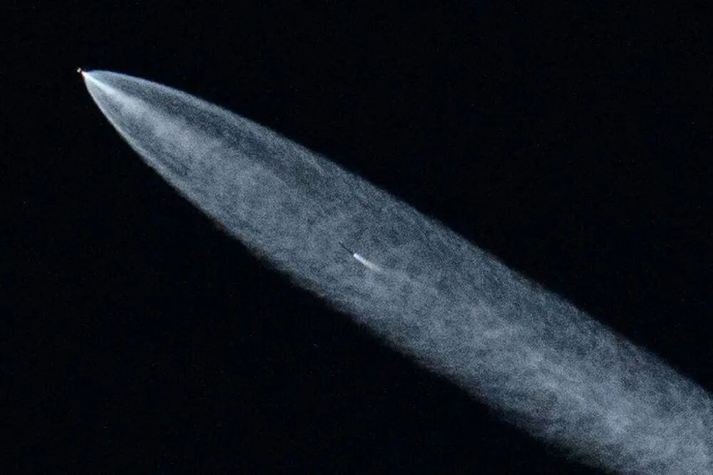 这张2024年6月18日在美国加利福尼亚州朗代尔拍摄的照片显示,搭载着“星链”卫星的“猎鹰9”火箭从范登堡太空军基地发射升空。新华社/法新