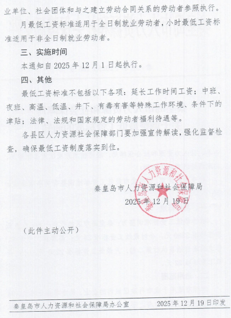 本次调整的最低工资标准自2025年12月1日执行。