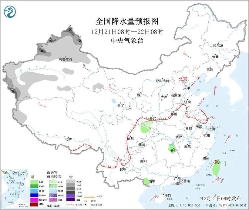 12月21日08时至22日08时,新疆北疆北部、伊犁河谷和南疆西部山区、西藏西部等地部分地区有小雪或雨夹雪,其中,新疆北疆北部、伊犁河谷和南疆西部山区等地部分地区有中到大雪,南疆西部山区局地暴雪(10~17毫米)。湖南中北部、四川盆地东北部、广西西南部、台湾岛等地部分地区有小雨。内蒙古中东部、新疆北疆东部、西藏北部、青海西部、陕西北部等地有5~6级风,阵风6~8级。