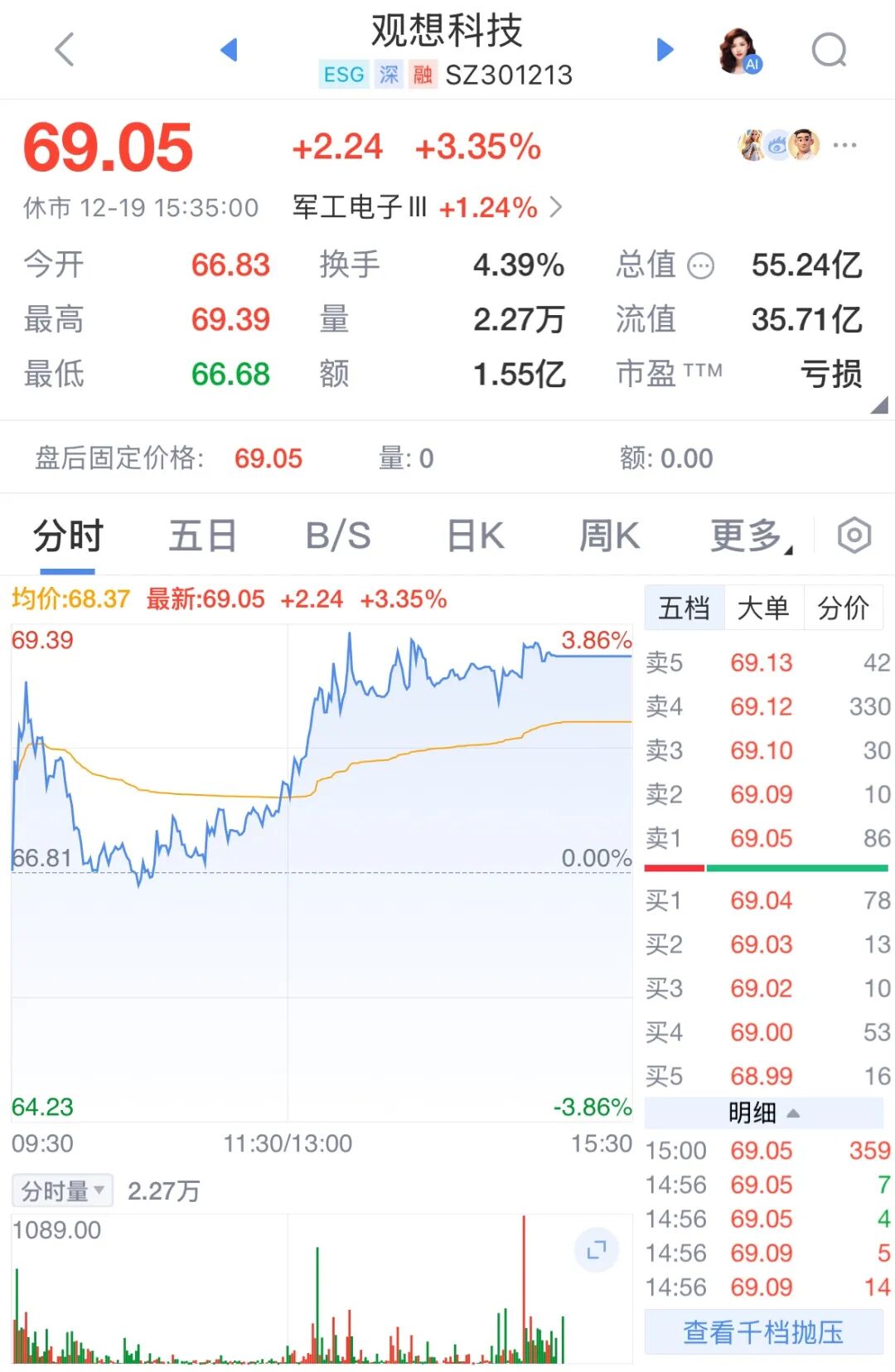 截至12月19日收盘,观想科技收于69.05元,上涨2.24元,涨幅为3.35%。