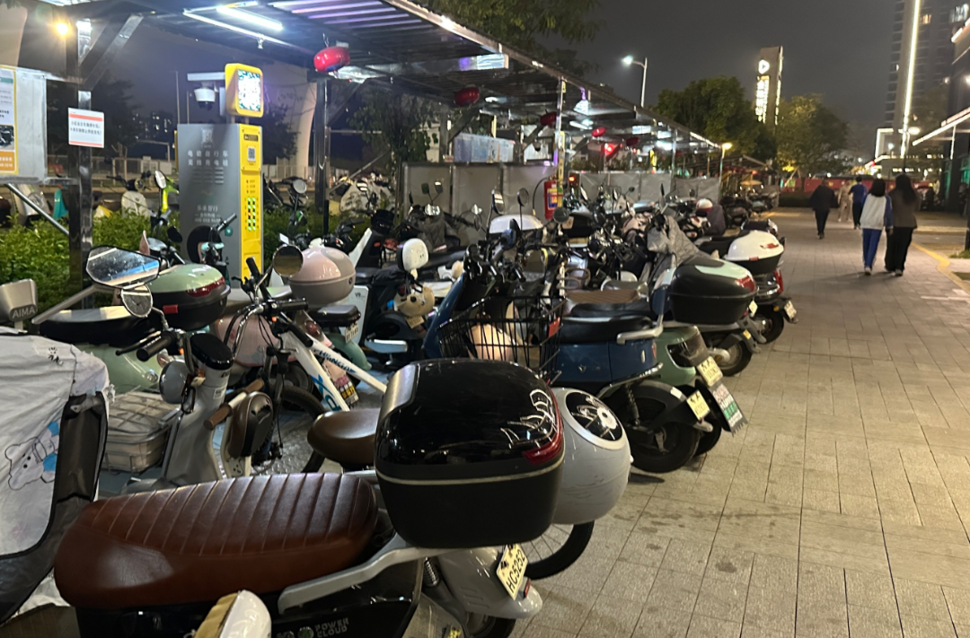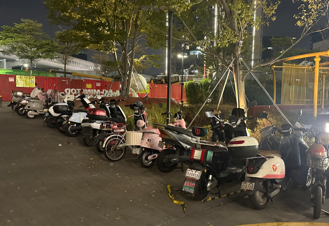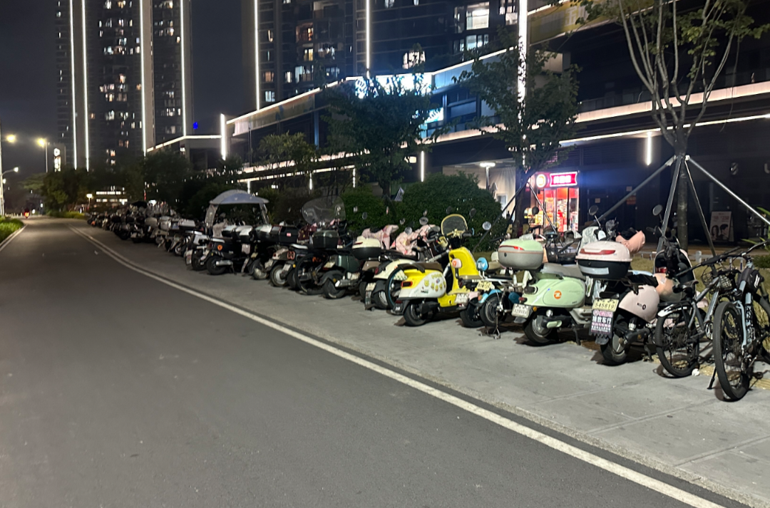 电动自行车集中停放区域与附近一处儿童娱乐点距离较近,晚间有不少市民携带孩子在附近活动,还有市民在电动自行车停放处旁进行羽毛球等运动。据周边市民及商户反映,小区电动车密集停放的情况长期存在,但暂未发生过起火或电池故障等安全事件。