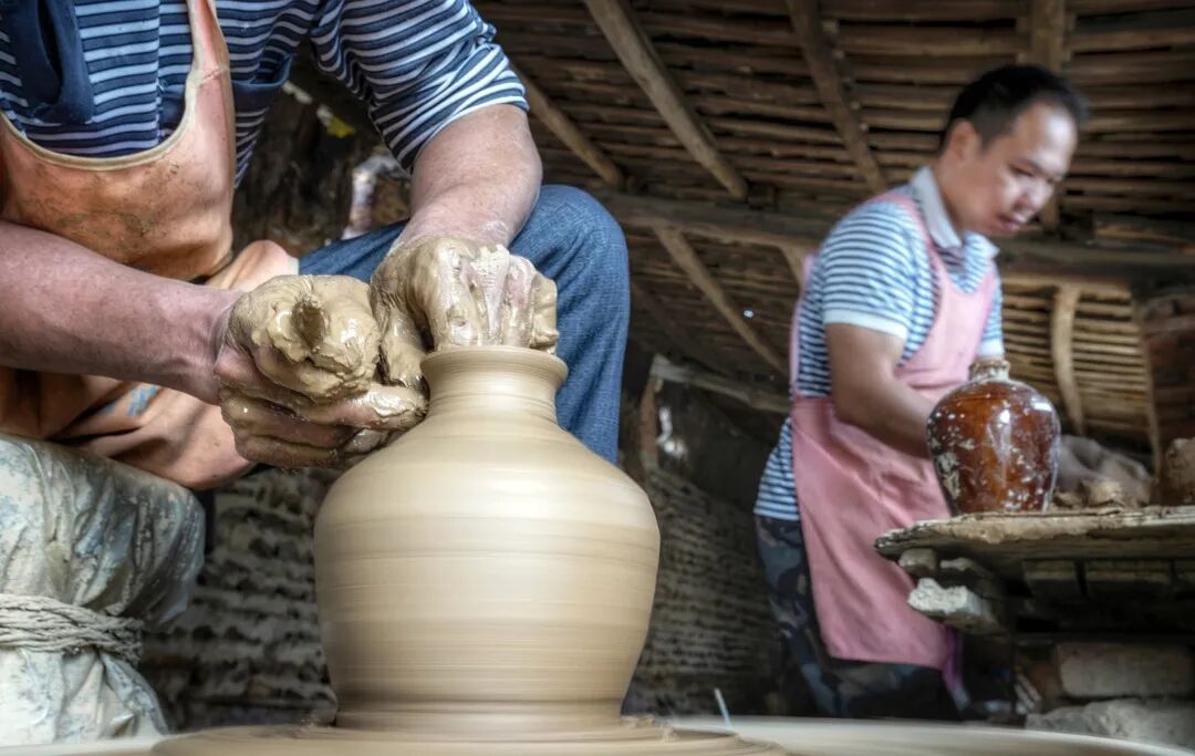 我走进一个不起眼的工作坊。一位年迈的拉坯师傅正坐在辘轳车前,他的双手沾满泥浆,神情专注得如同一位高僧入定。一坨毫无生气的陶泥,在他手中仿佛被赋予了生命。随着转轮的旋转,他的手指微微用力,泥土便顺从地向上生长,时而收拢,时而敞开。仿佛不是他在塑造泥土,而是泥土在他的掌心,自己找到了它本该成为的形状——一个优雅的瓶身,渐渐显现。